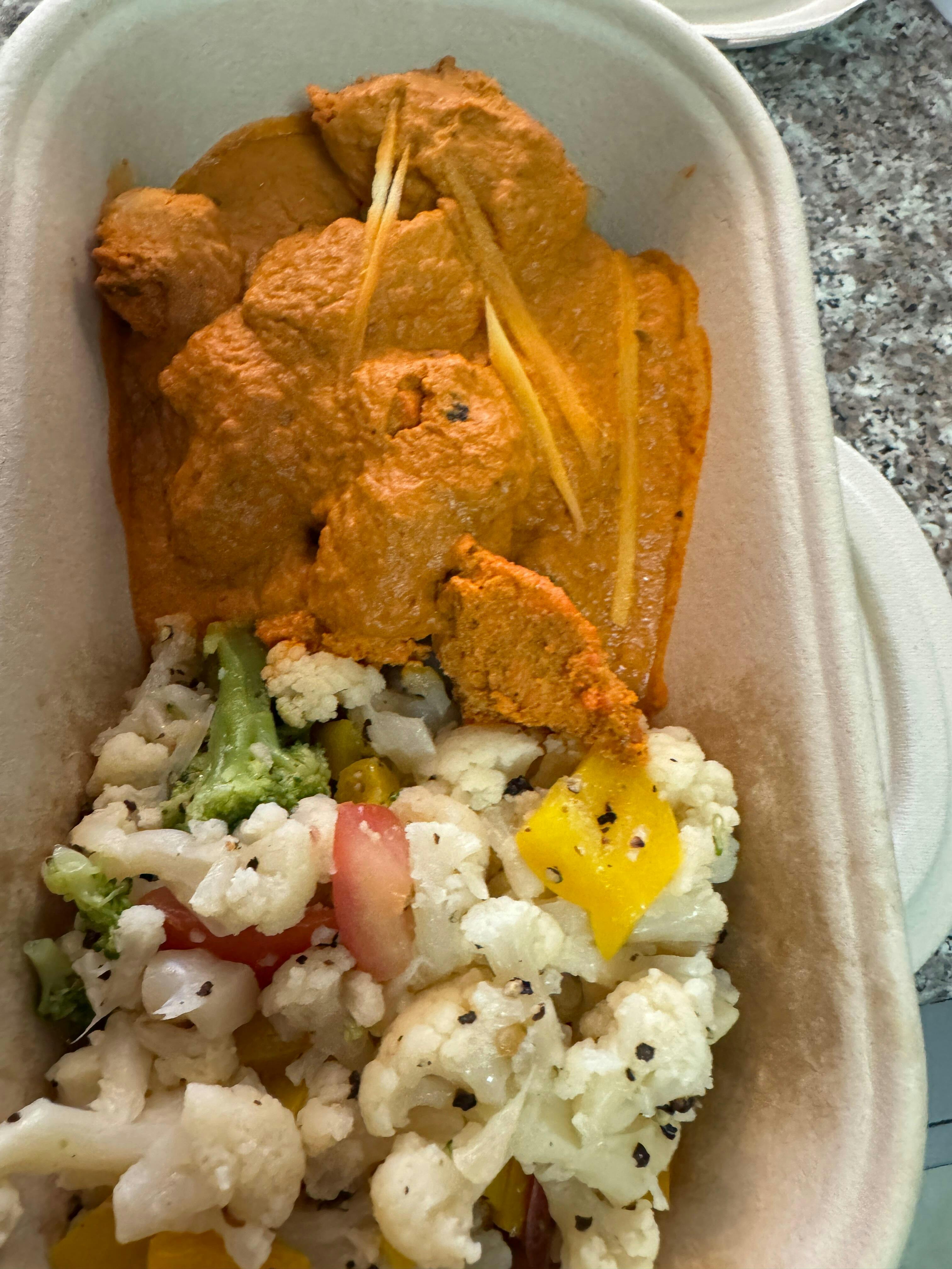 Chicken, Broccoli, Cauliflower, Tomato, Yellow Pepper, Natural Red Colouring Powder, Yoghurt, Ginger, Garlic, Garam Masala, Lemon Juice, Kasoori Methi Leaf, Nutmeg, Mustard Oil, Cumin, Chat Masala, Kitchen King Masala, Cashew, Grapeseed Oil, Onion, Tomato, Coriander, Turmeric, EVOO, Salt, Pepper
