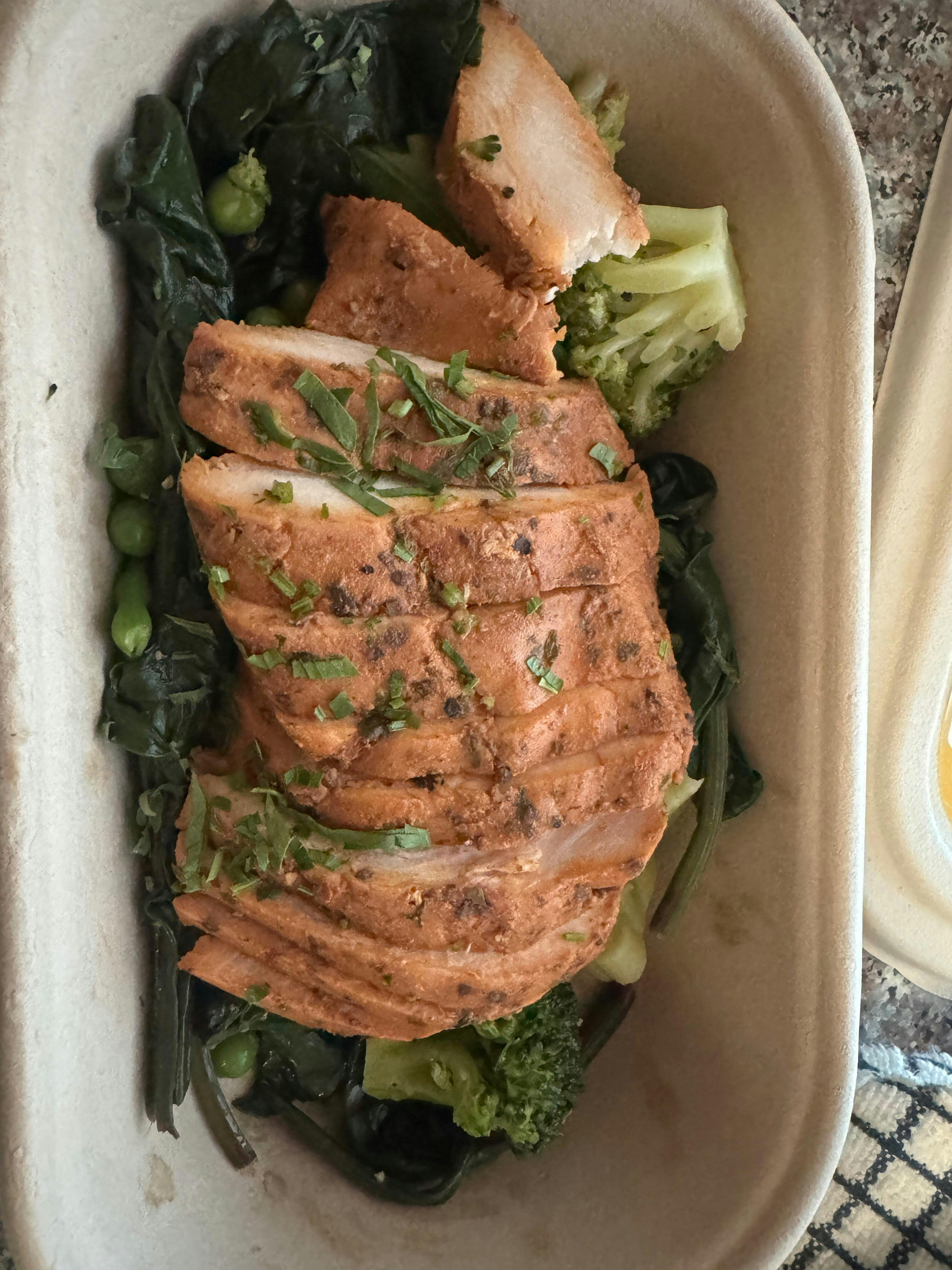 Chicken, Broccoli, Spinach, Sugar Bean, Pea, Orange Marmalade, Sweet Chili Sauce, Garlic, White Balsamic Vinegar, Shallot, Olive Oil, Salt, Pepper